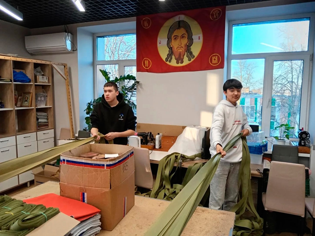 На базе гуманитарного штаба «Мы Вместе» студенты колледжа с энтузиазмом включились в работу по подготовке материалов для плетения маскировочных сетей, которые будут направлены на передовую. К ним также присоединились активисты-волонтёры «Движения Первых».